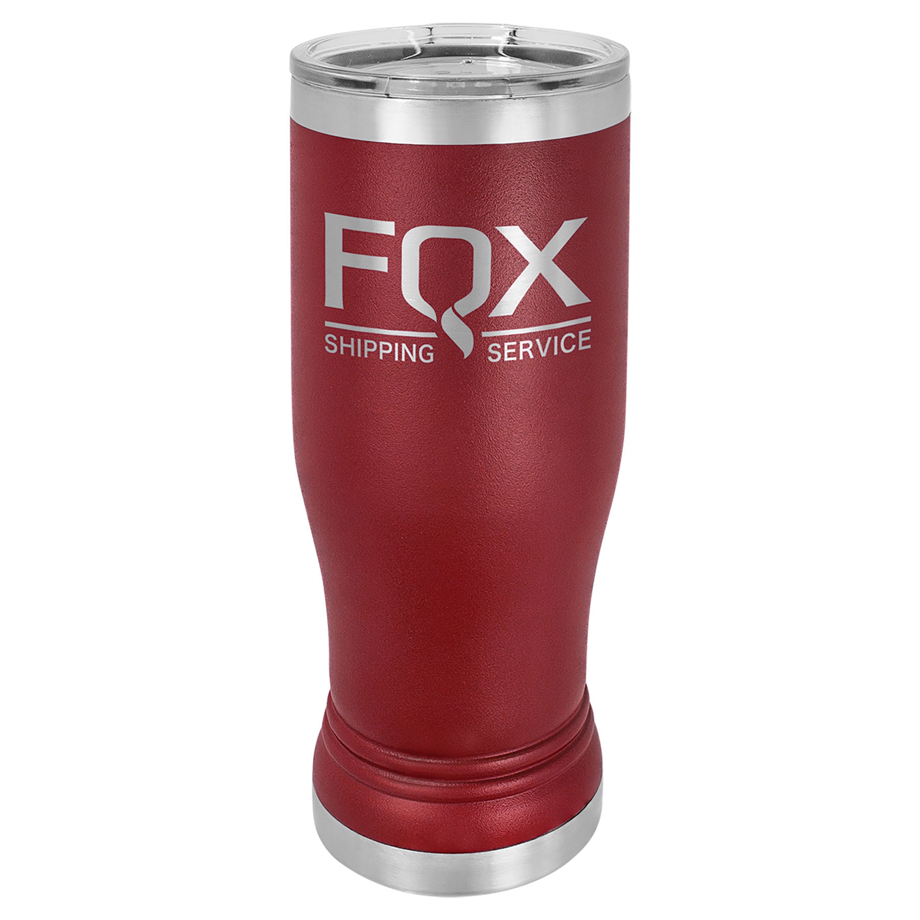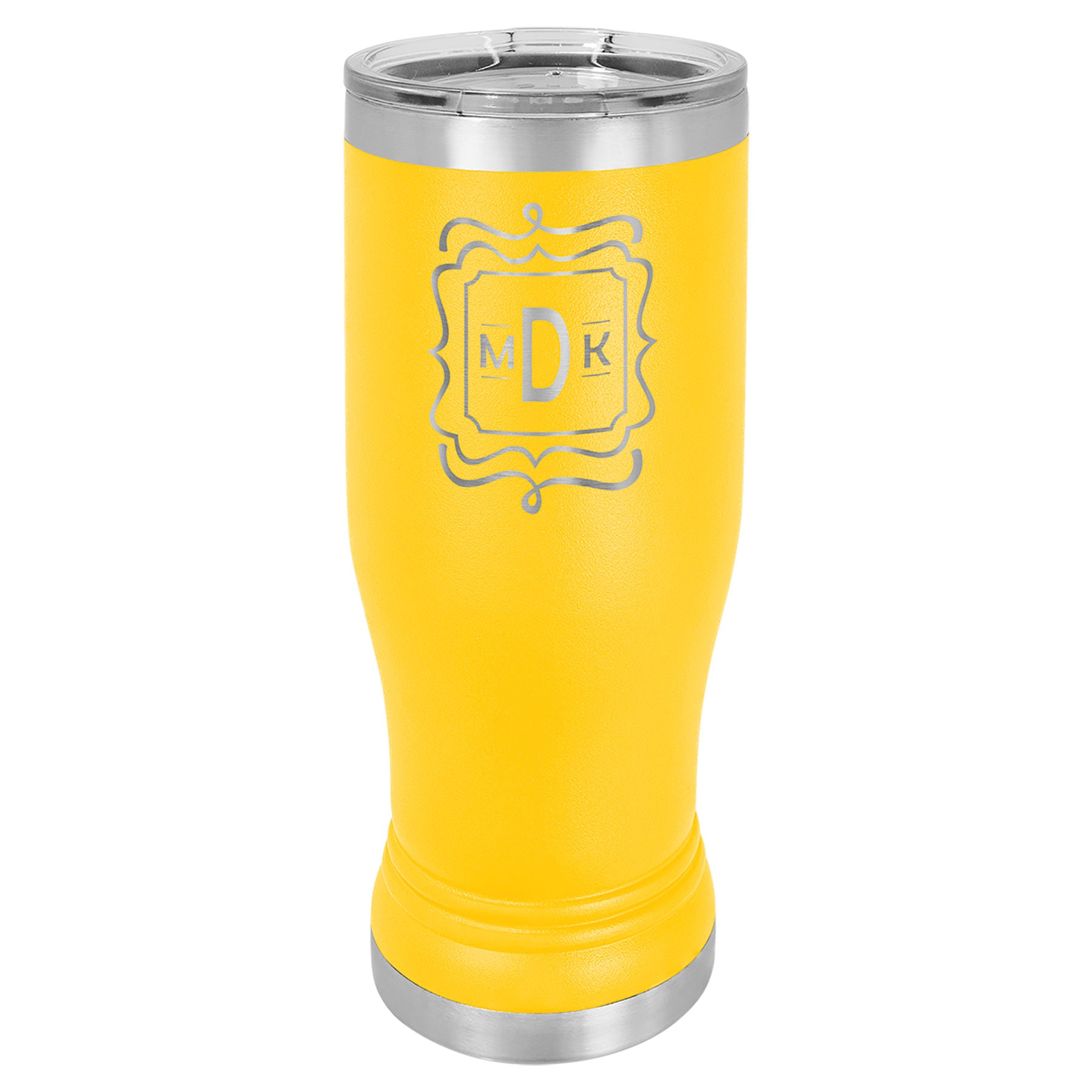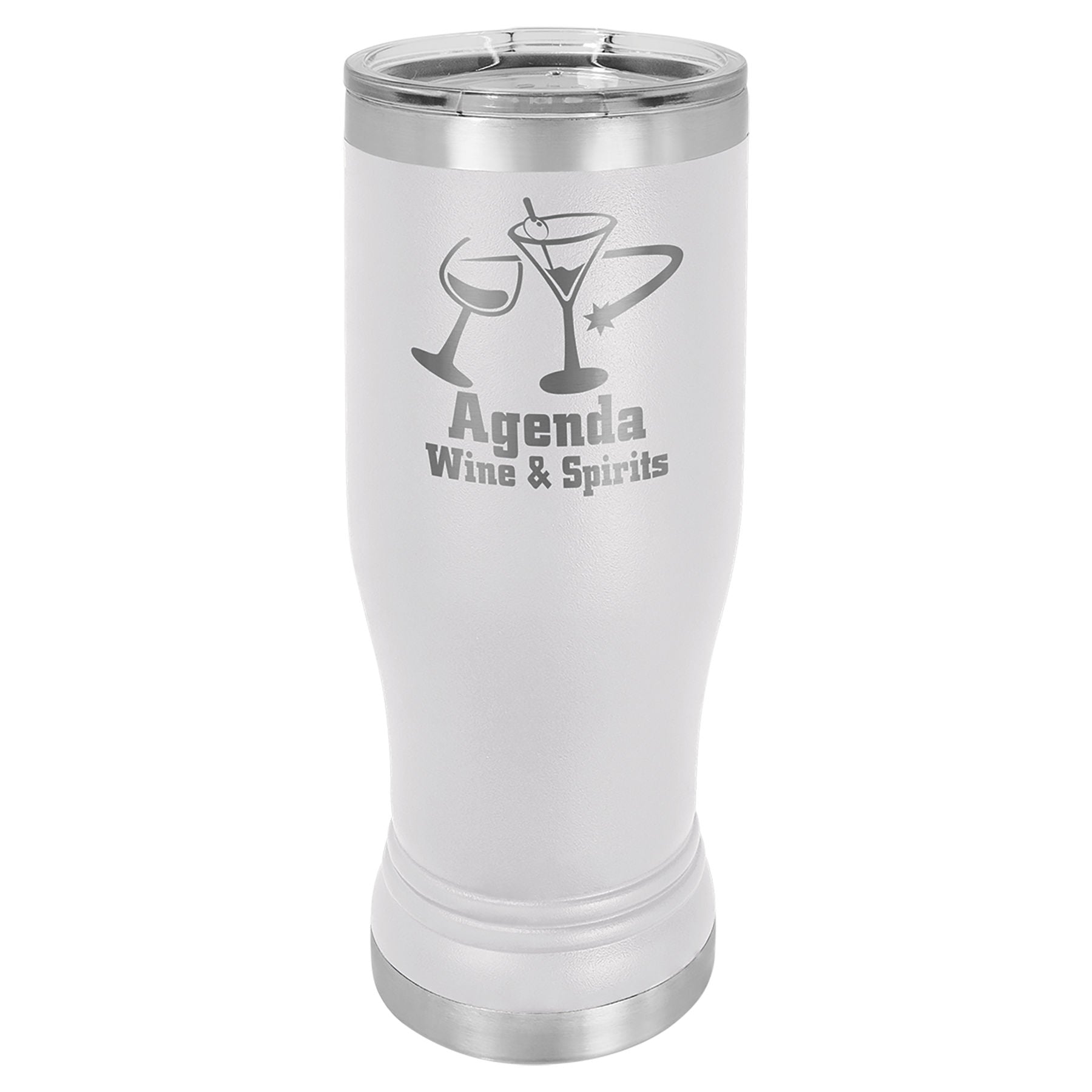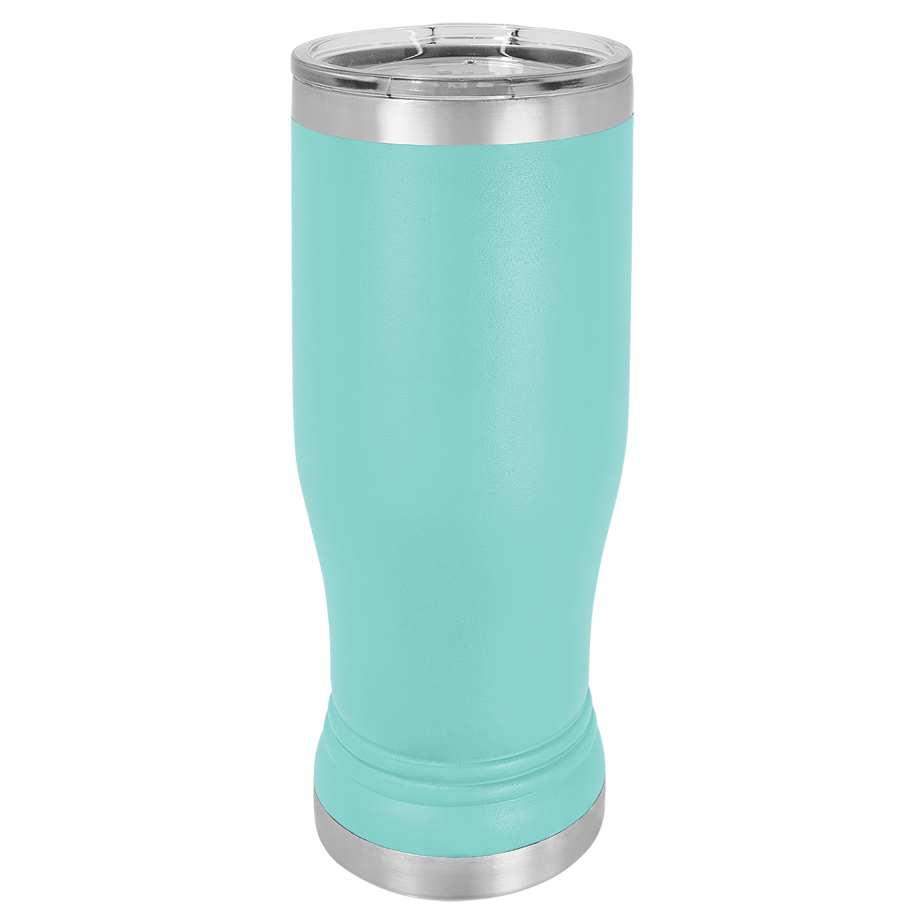 14 oz. Powder coated Stainless Steel pilsner style tumbler feature double-wall, vacuum insulation with a clear lid.