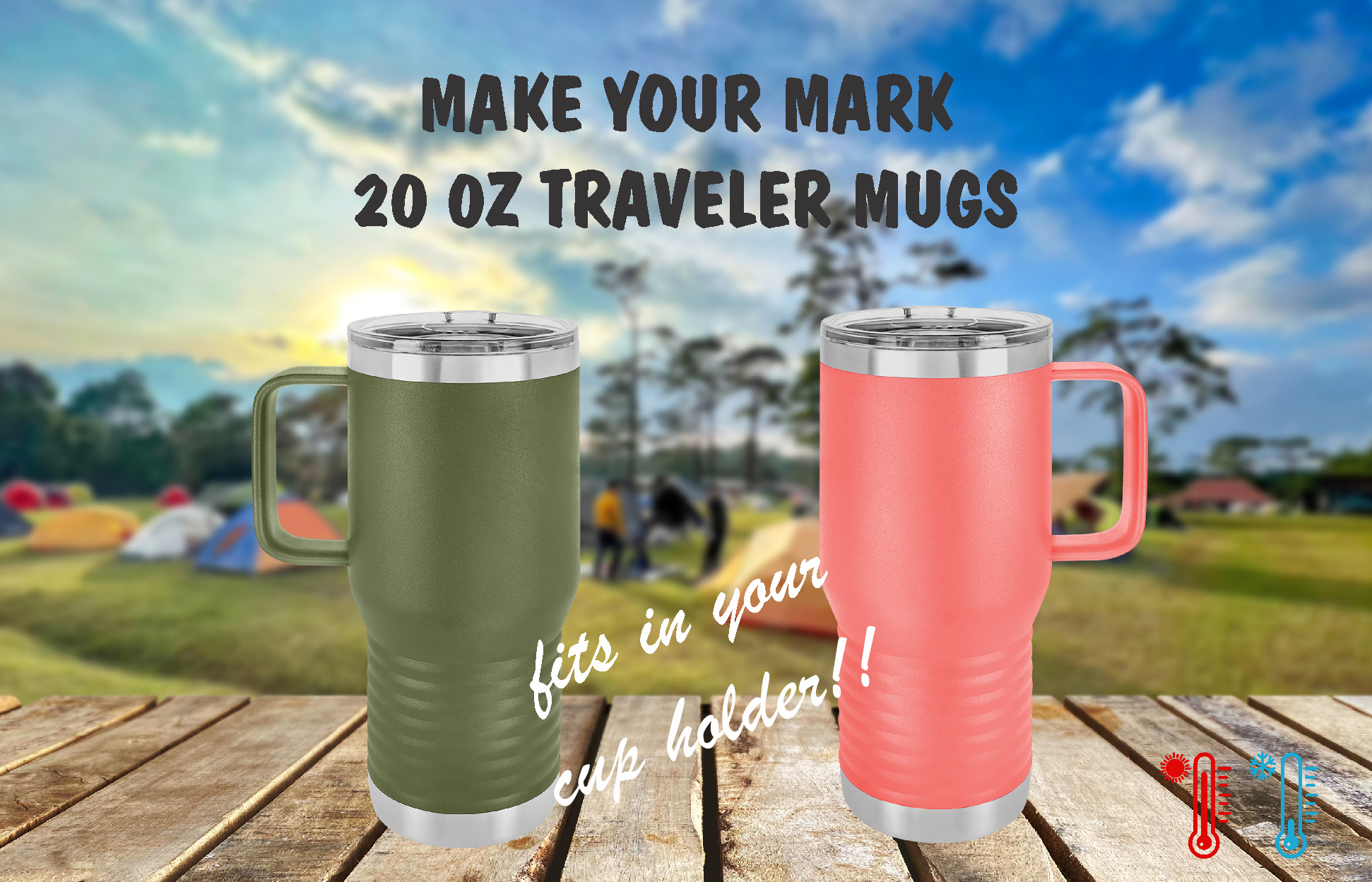 20oz. Powder coated Stainless Steel TRAVEL / CAMPER tumbler feature double-wall, vacuum insulation with a clear slider lid.