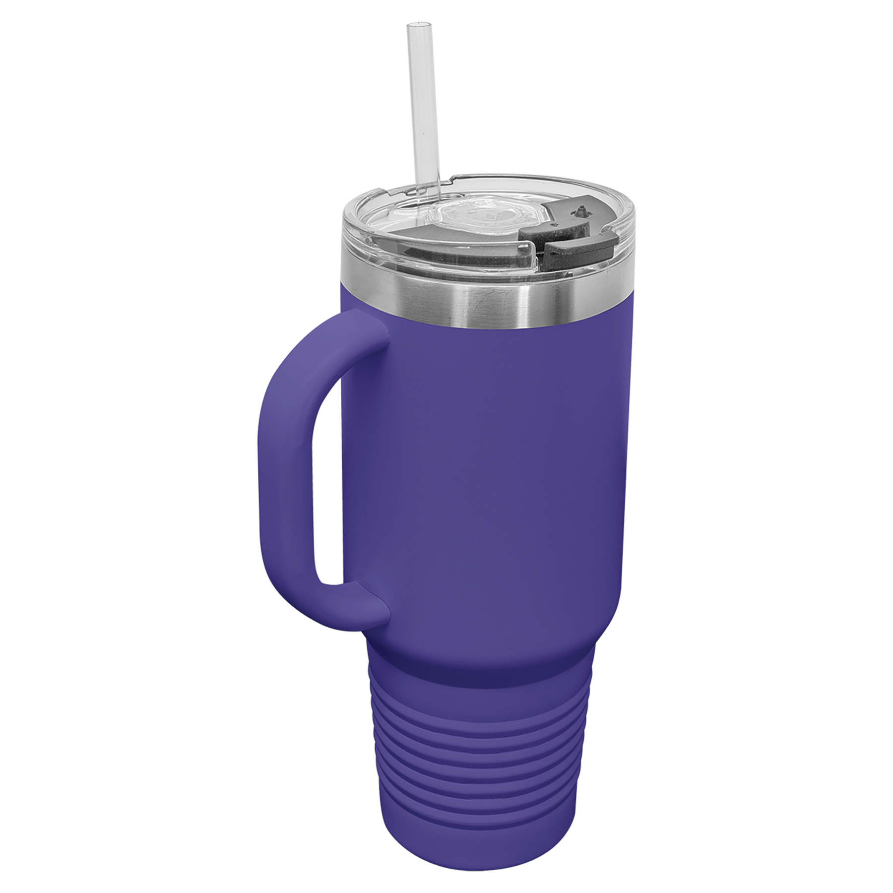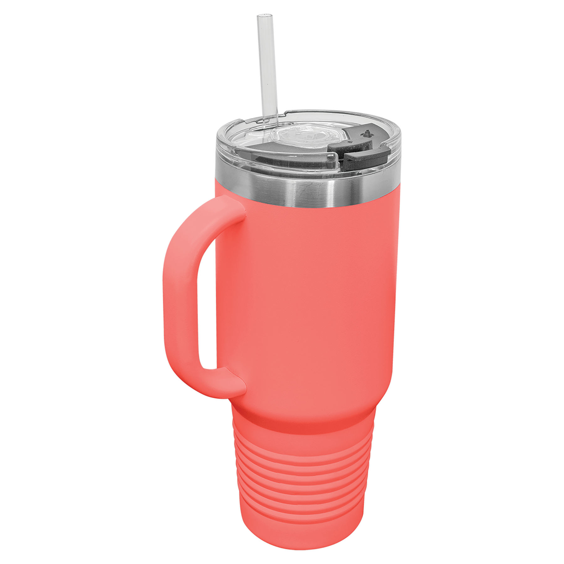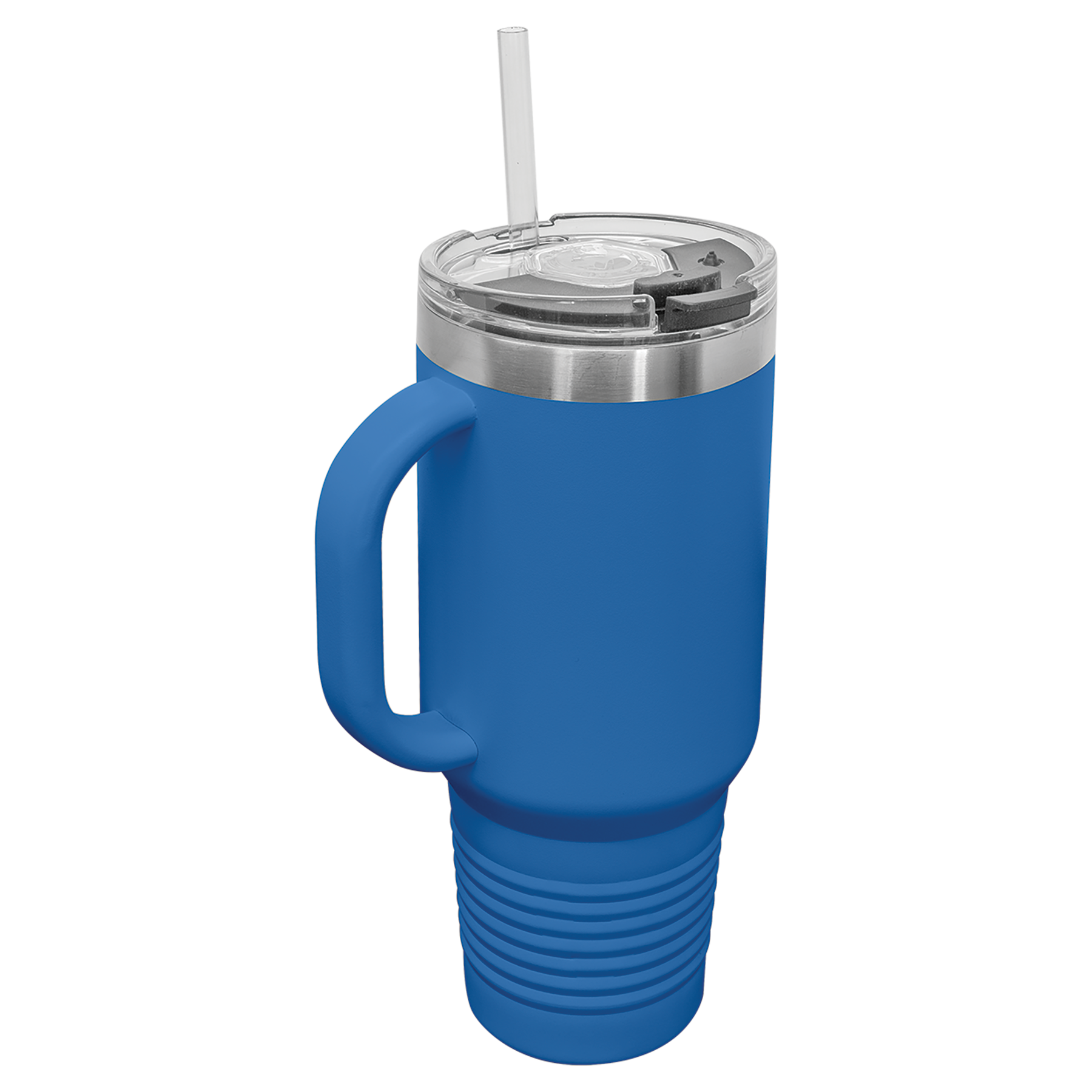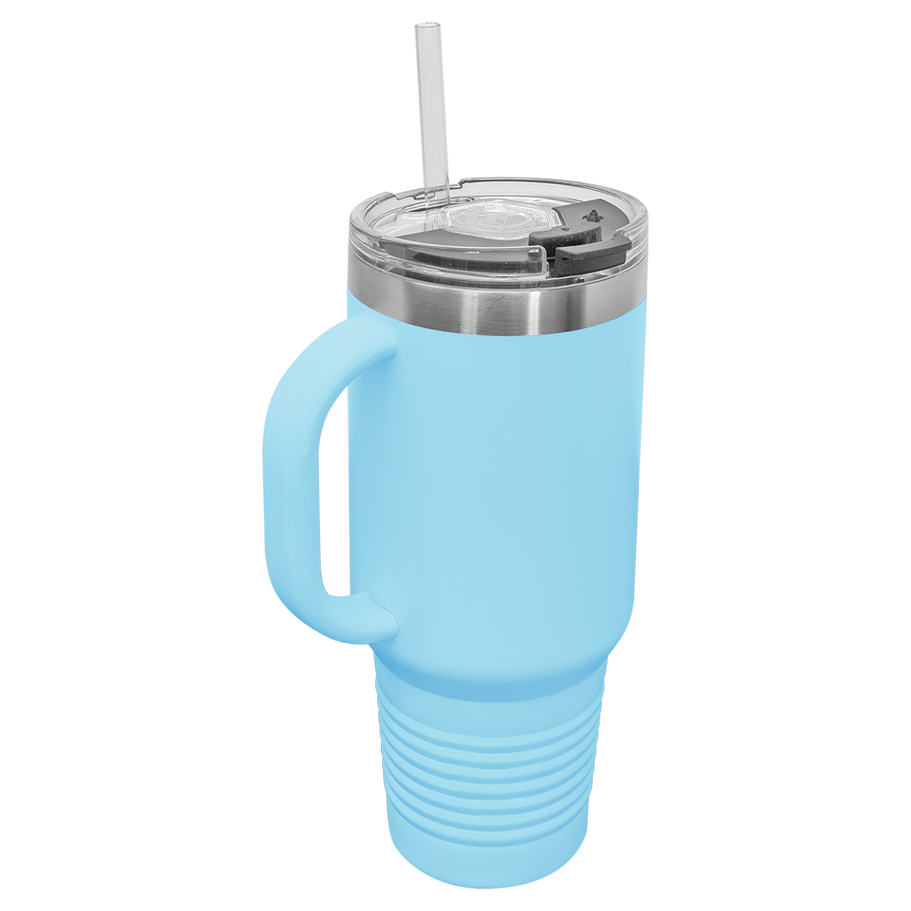 40 oz. Powder coated Stainless Steel TRAVEL tumbler feature double-wall, vacuum insulation with a clear lid and straw