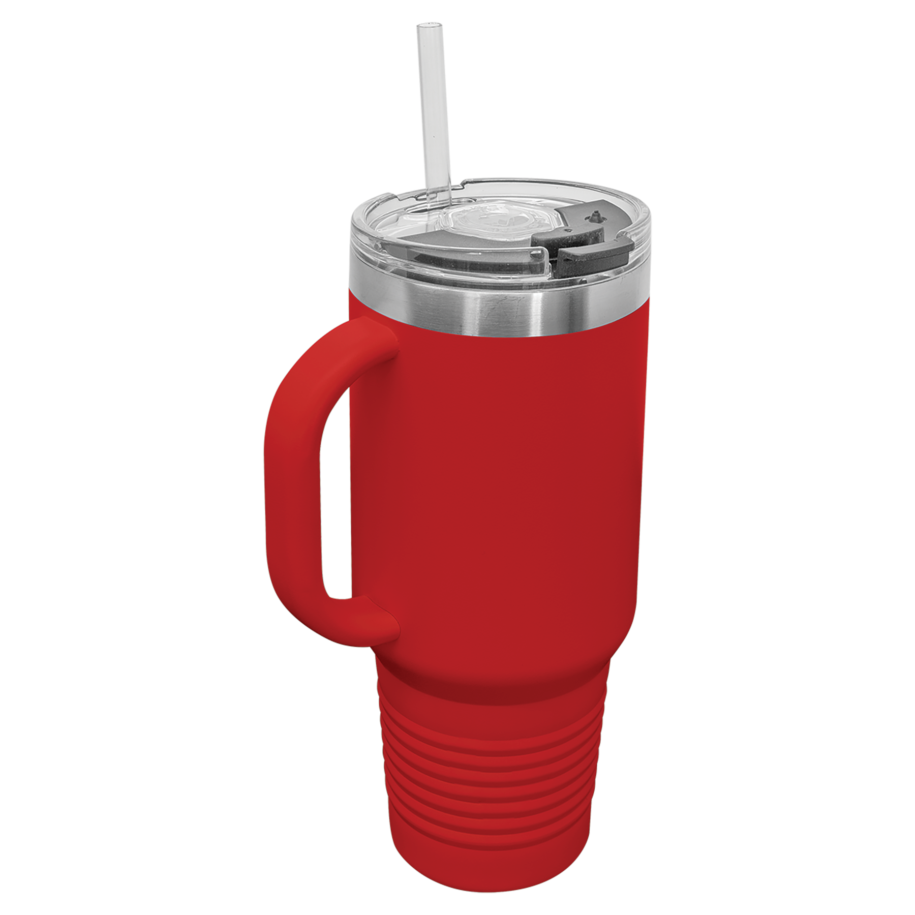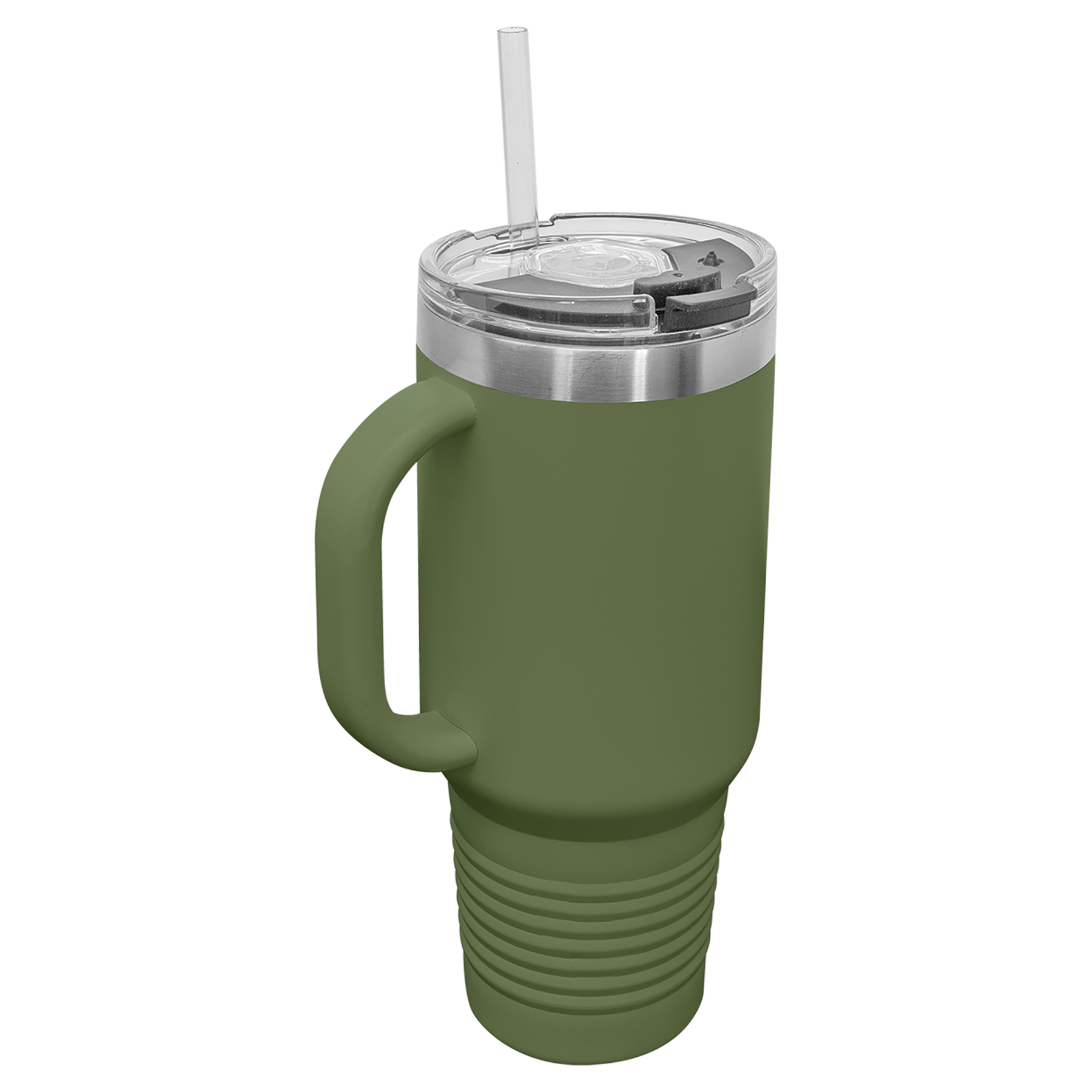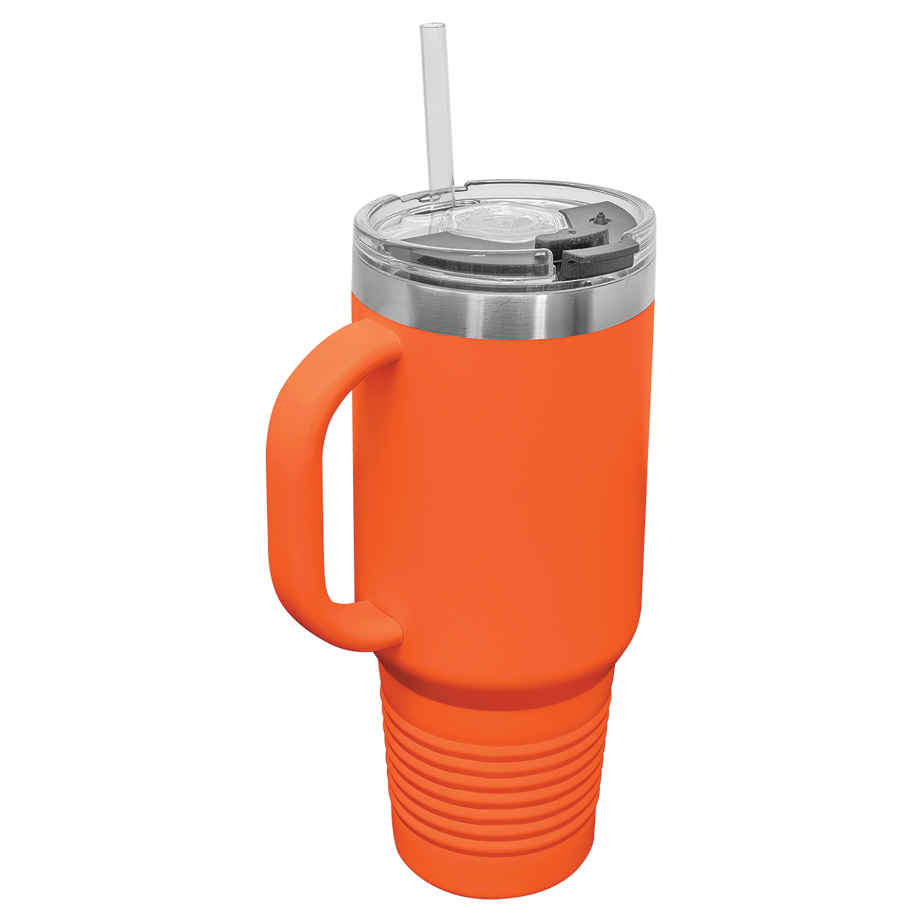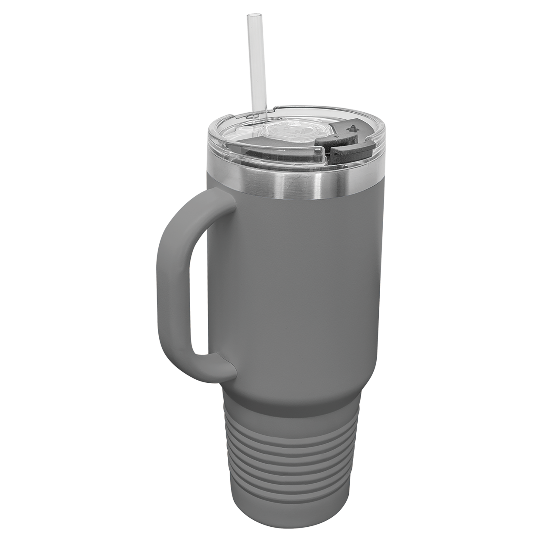 40 oz. Powder coated Stainless Steel TRAVEL tumbler feature double-wall, vacuum insulation with a clear lid and straw