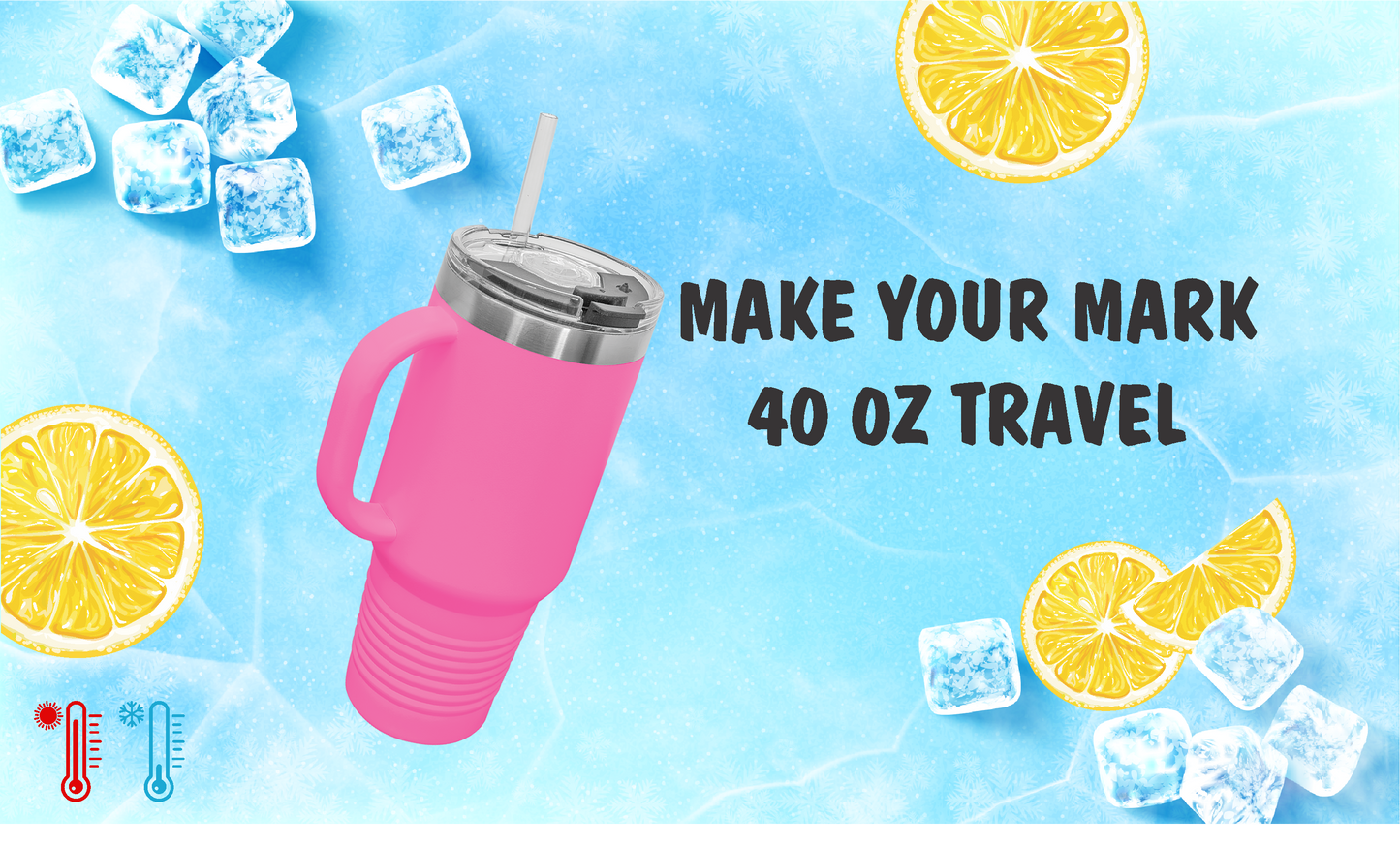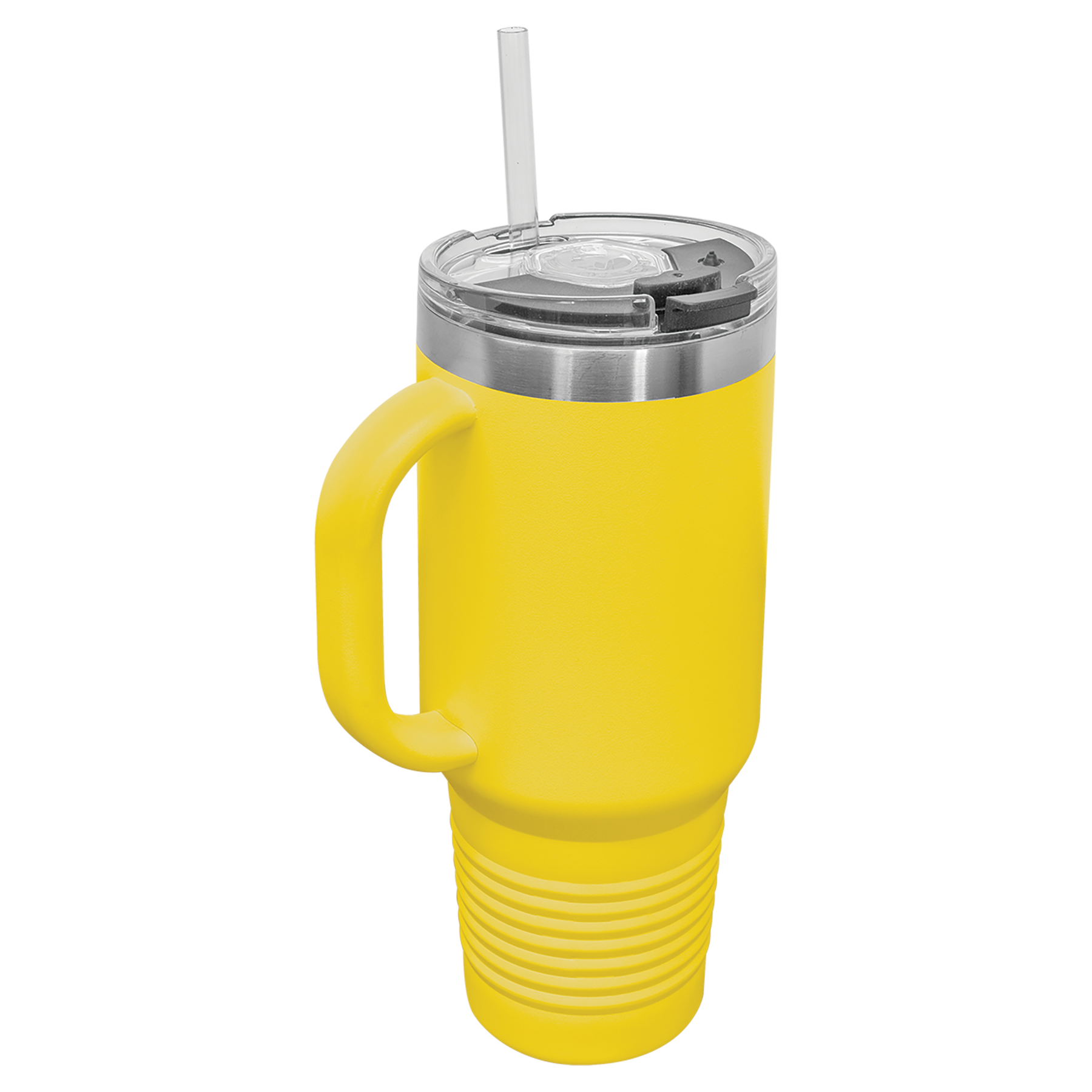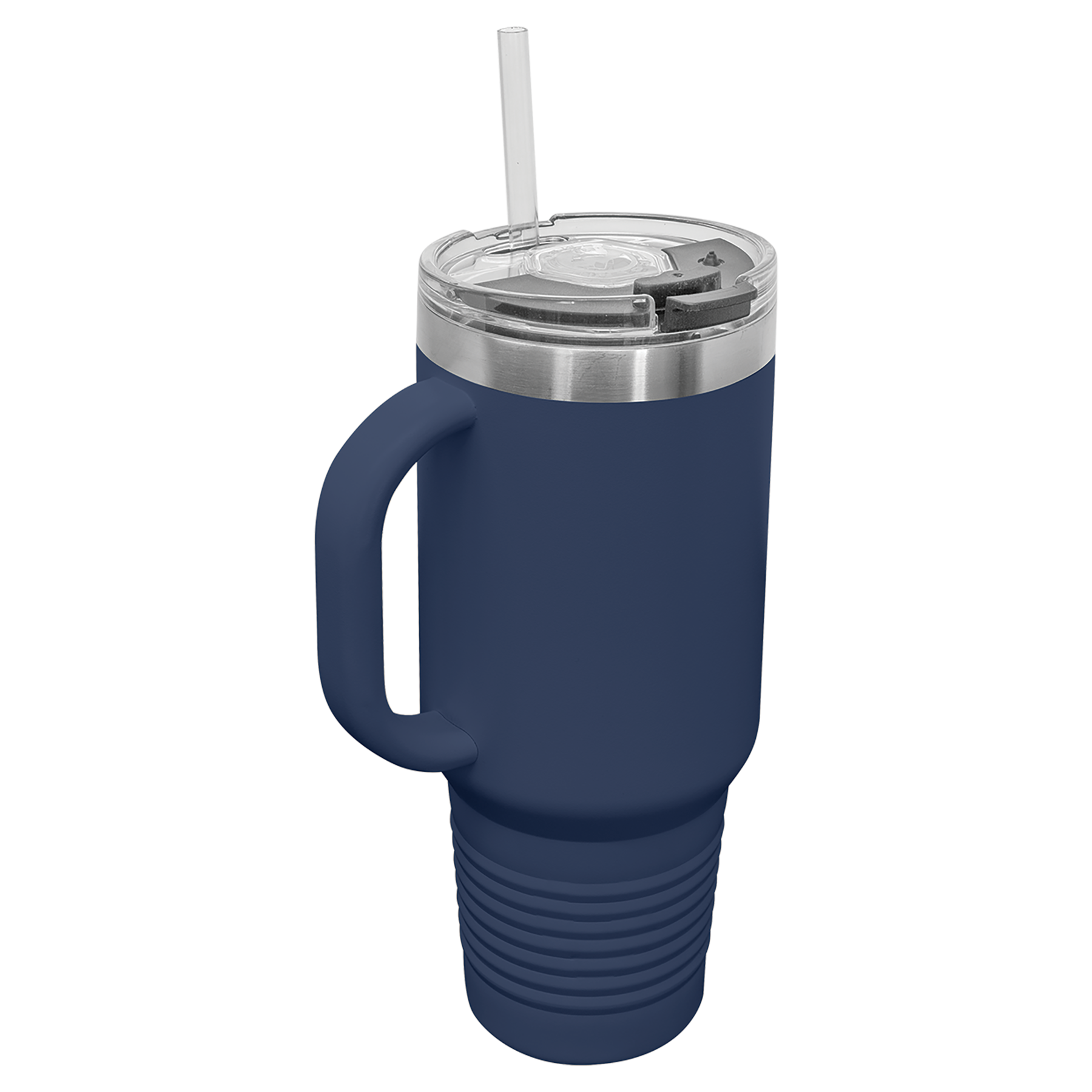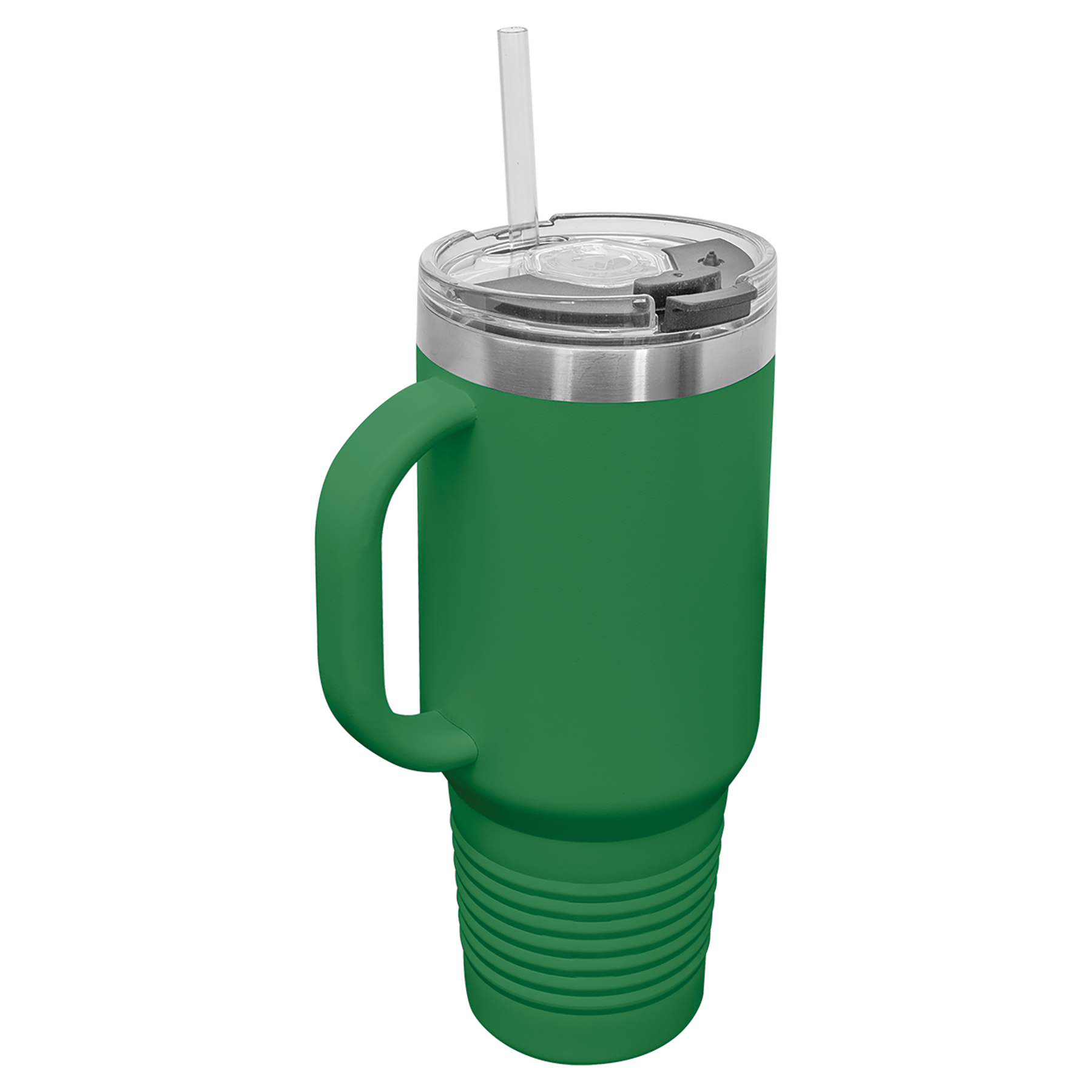 40 oz. Powder coated Stainless Steel TRAVEL tumbler feature double-wall, vacuum insulation with a clear lid and straw